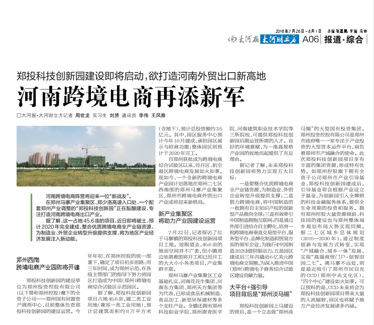 2018年7月26日,大河報·大河財立方A06版對我公司鄭投科技創新園項目進行了報道。